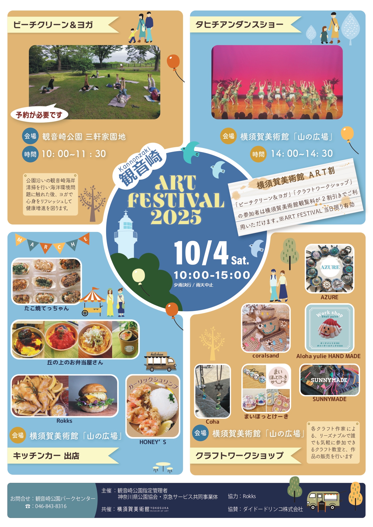 気軽にご参加いただけるクラフトワークショップのほか、ビーチクリーン&ヨガ体験、タヒチアンダンスショー、地元横須賀に拠点を置くキッチンカーの出店もあります。
