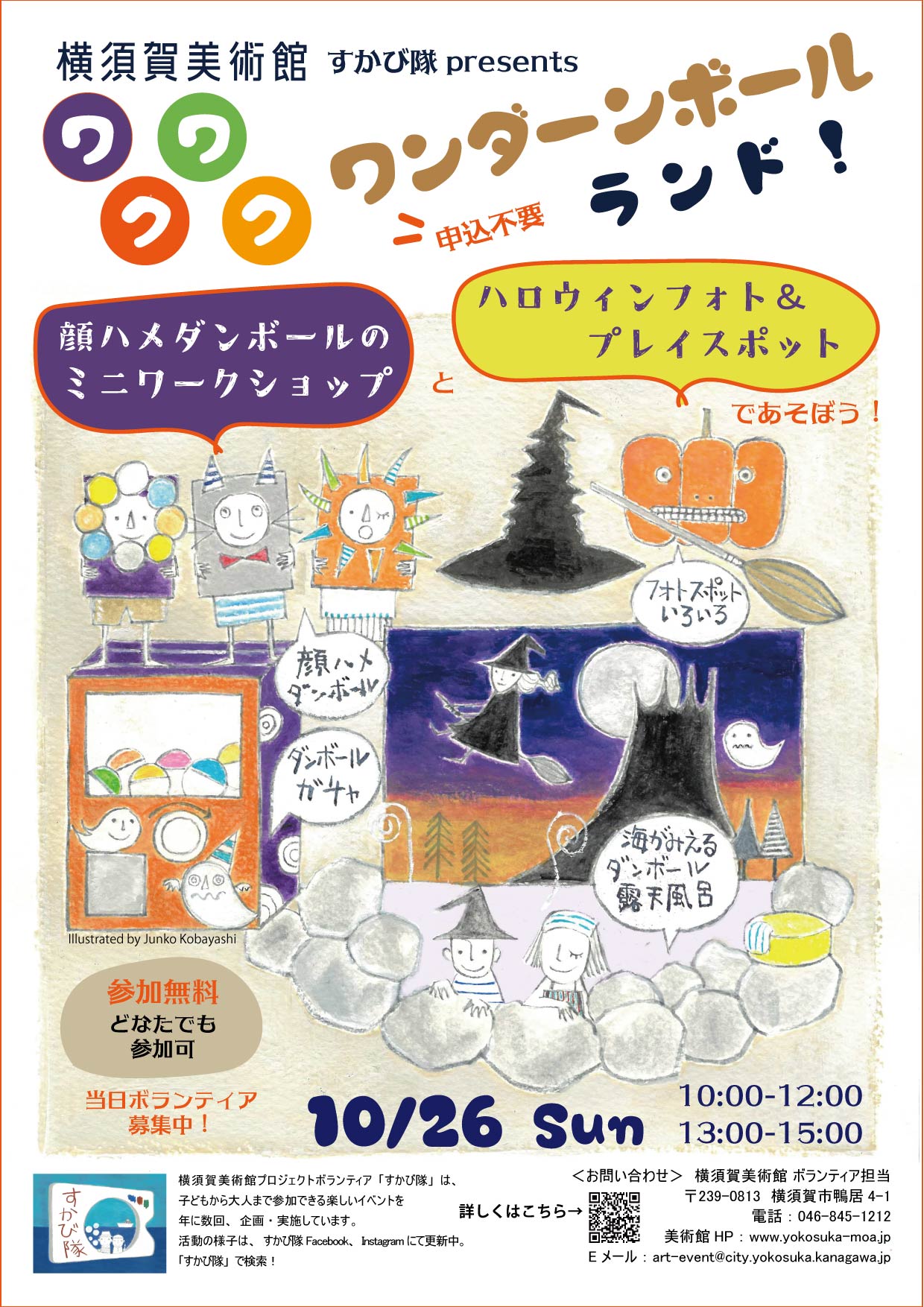 当日ボランティア募集 | イベントの開催に合わせて、お手伝いをしてくださるボランティア(高校生以上)を募集します。10月23日(木)までに標題を「当日ボランティア希望」とし、住所・電話・氏名・年齢をご記入の上、Eメール(art-event@city.yokosuka.kanagawa.jp)にてお申し込みください。詳細をこちらからご連絡いたします。 |
