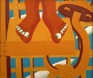鮮やかな黄色と、青と白をつかって、裸足の人物の足元、ロープをひっかけたクレーンの鉤が、大きく、明快に描かれています。鉄骨の格子の背景には紡錘形の白い雲が連続し、重なりあって、ジャズの力強いリズムを刻んでいるかのようです。ここでは、人間と機械は対立するものではなく、互いに寄り添いながら働き、ともに成長しようとしています。すべてが破壊された戦争のあと、新しい都市、新しい時代を建設しようとした当時の人々の活気が伝わってくる作品です。